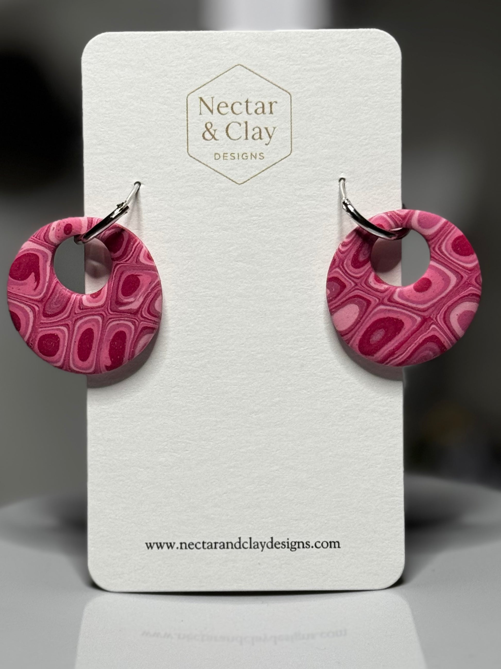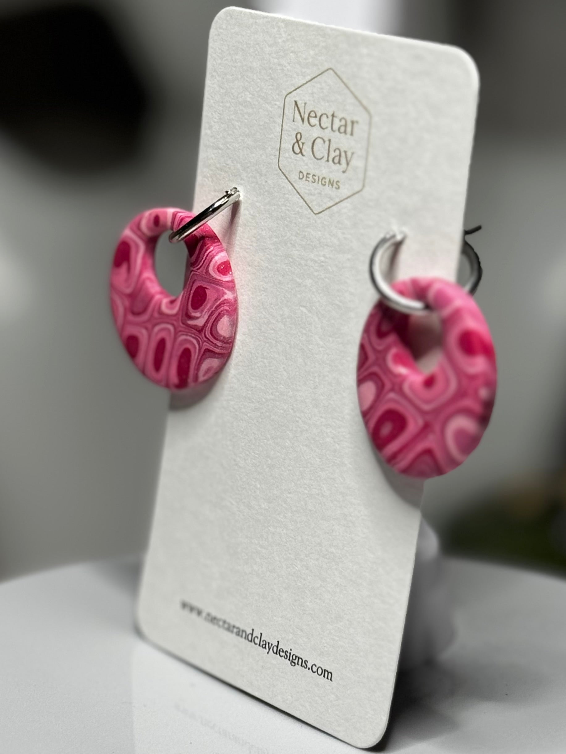 A bold pop of pink with a soft, artistic twist. The Berry Swirl hoops feature a lightweight clay design with a marbled blend of rosy pings and berry tones, creating a one-of-a-kind pattern on every pair. Finished with sleek stainless steel (Nickel Free) hoops, these are both comfortable enough for all-day wear and fun enough to make any outfit stand out.