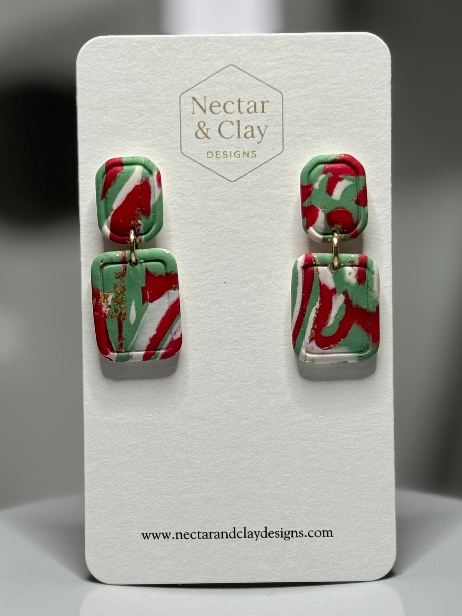 Our Candy Cane Stroll earrings feature a modern double-rectangle silhouette with a festive swirl of red, green, and white - reminiscent of classic peppermint candy canes. Finished with subtle gold accents, this lightweight pair brings just the right amount of holiday cheer while keeping a clean, contemporary feel. Perfect for seasonal gatherings, holiday parties, or adding festive flair to everyday outfits.