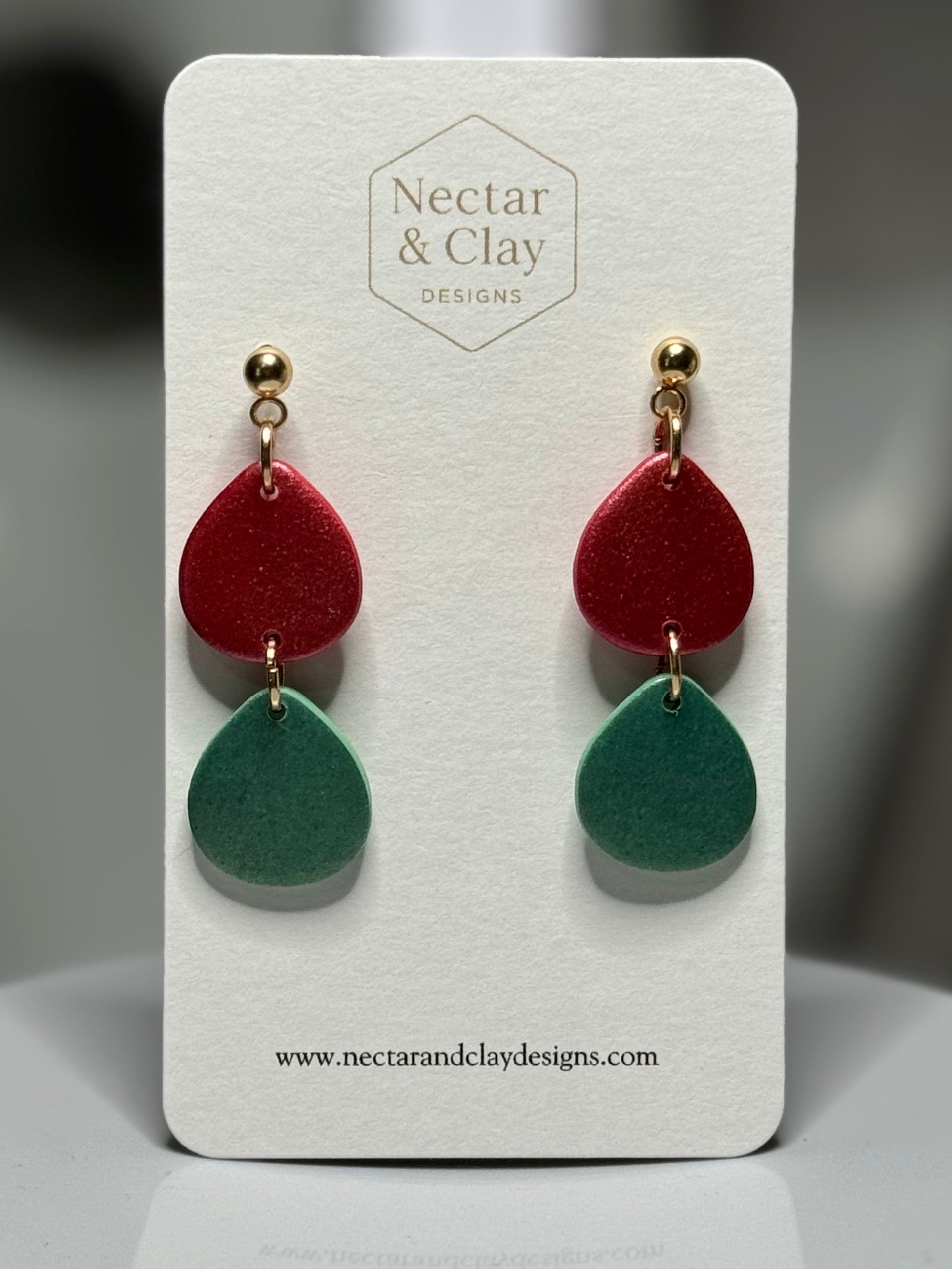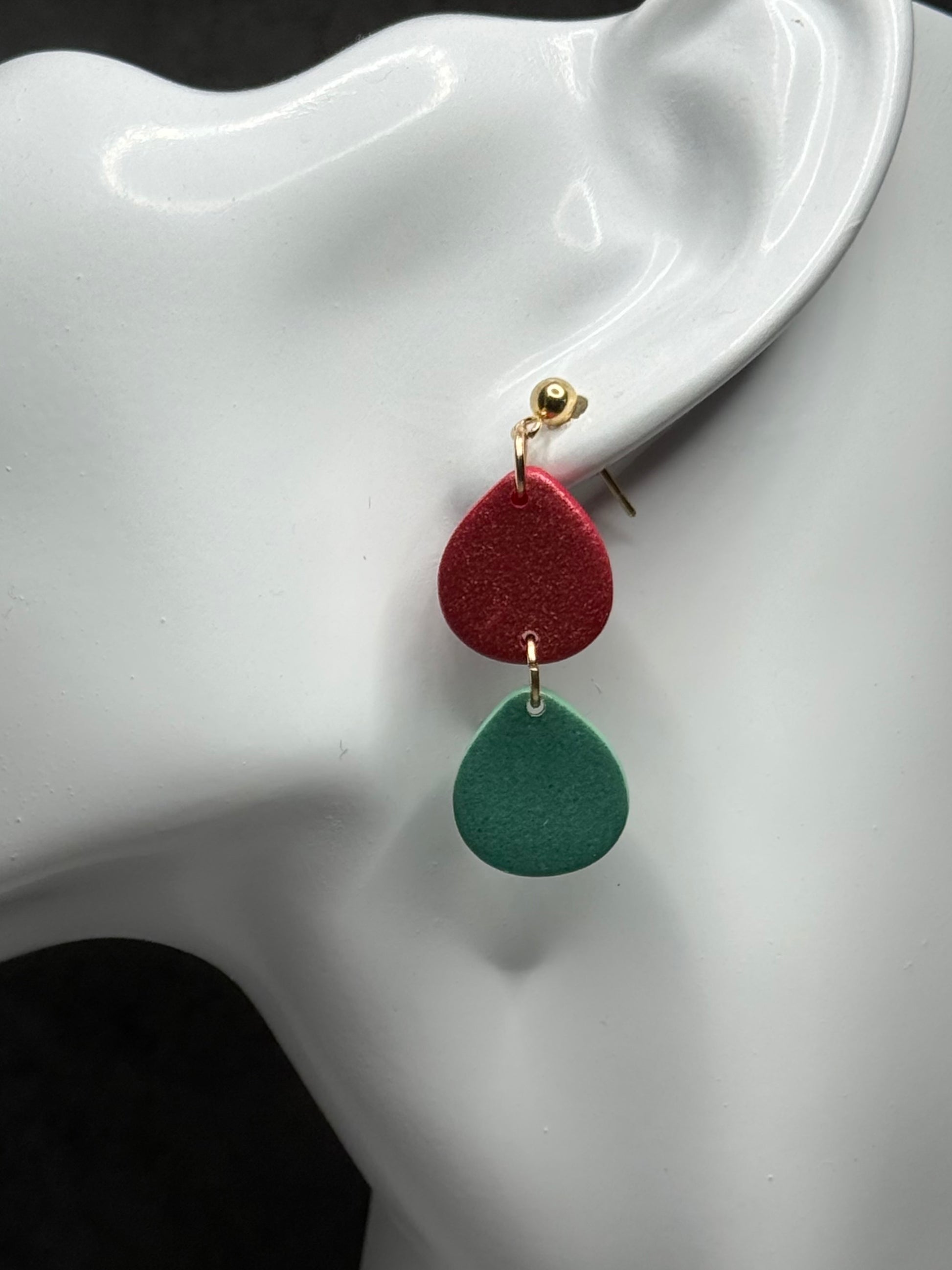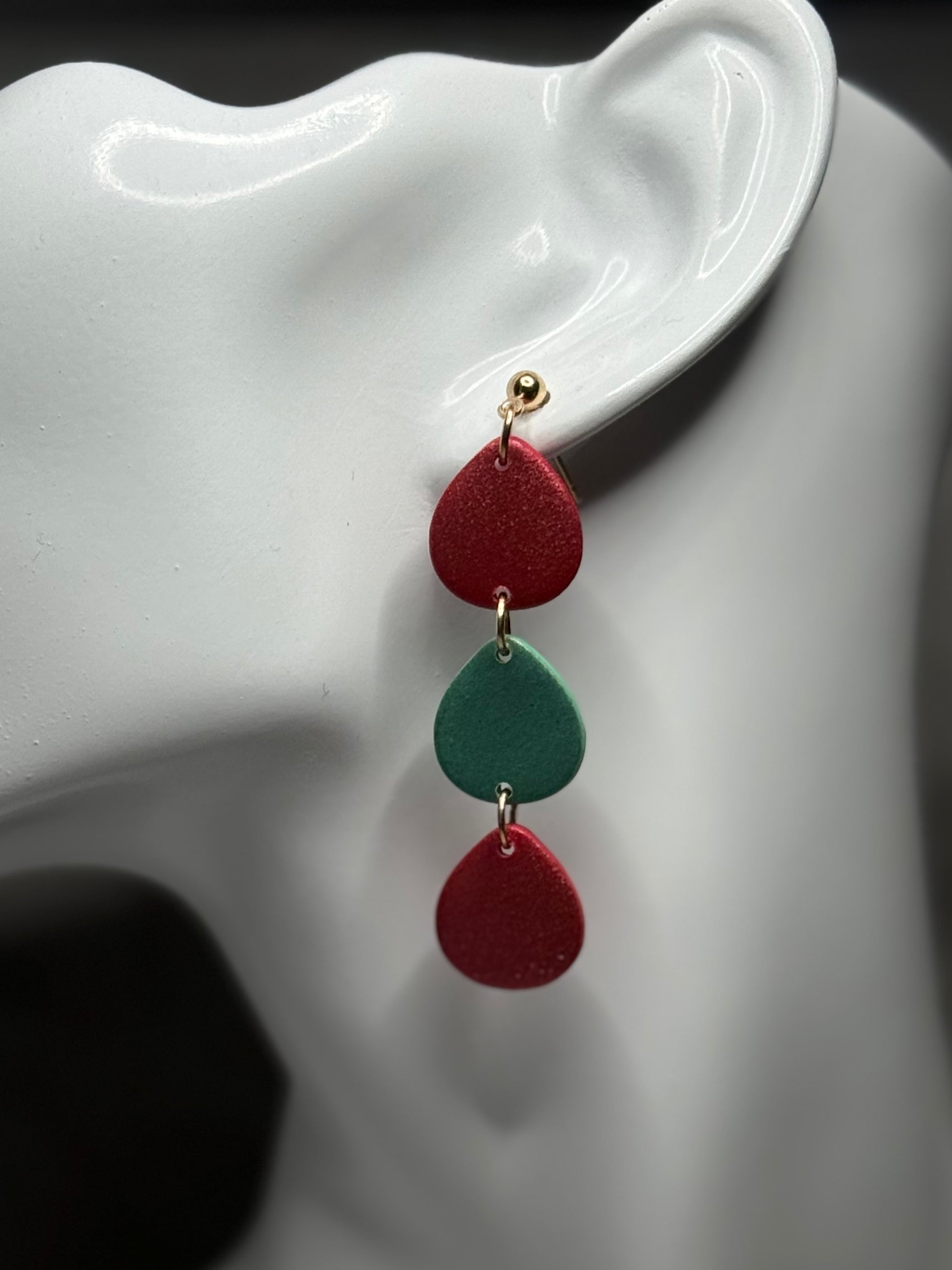 Sweet, colorful, and irresistibly fun - Gumdrops earrings bring a playful pop of candy-inspired charm to any look. each earring features a cascading duo or trio of soft, lightweight, shimmering clay pieces in juicy gumdrop tones of cherry red and minty green. Full of movement, they add just the right touch of whimsy while keeping things modern and wearable. Perfect for brightening everyday outfits or adding a festive twist for the holidays and beyond.