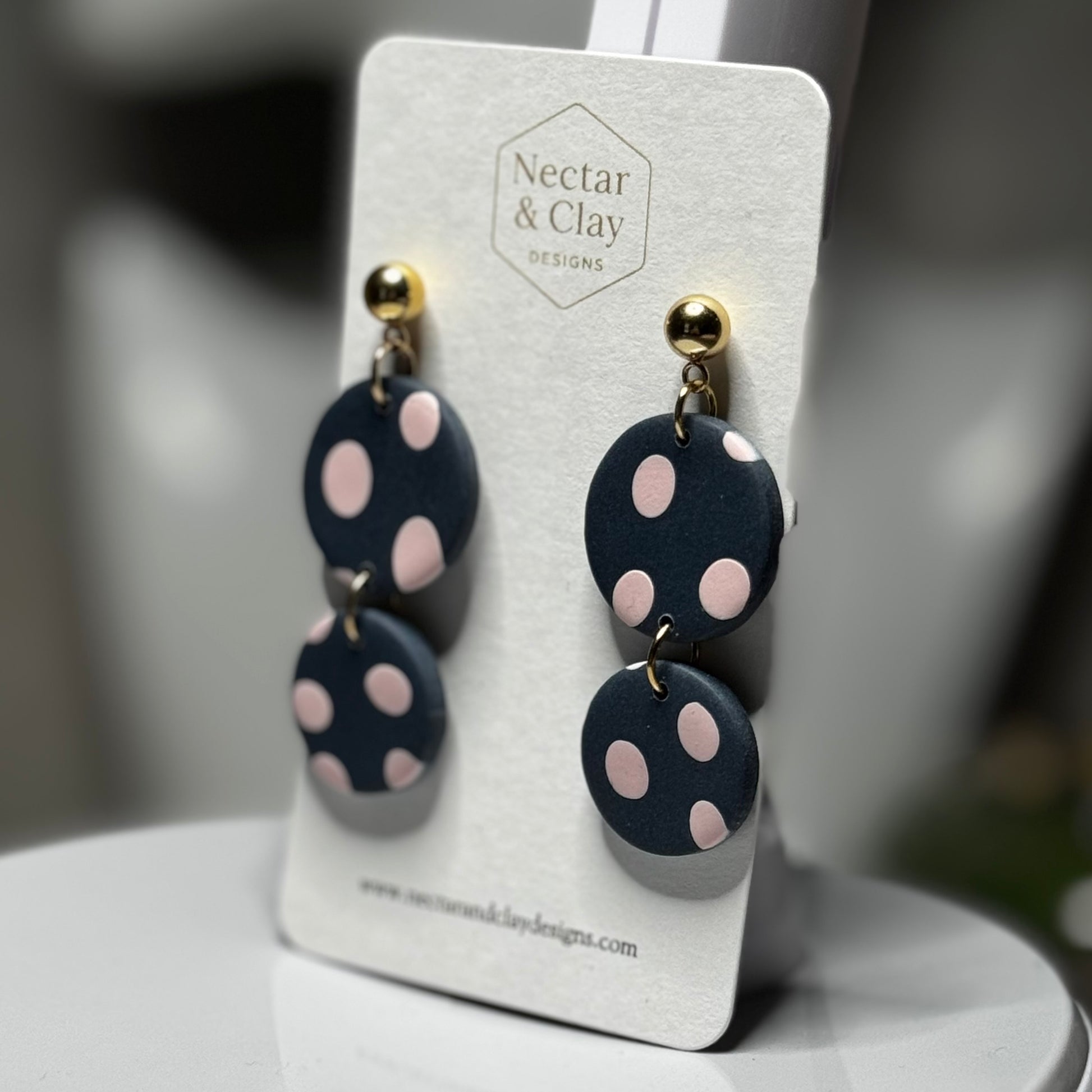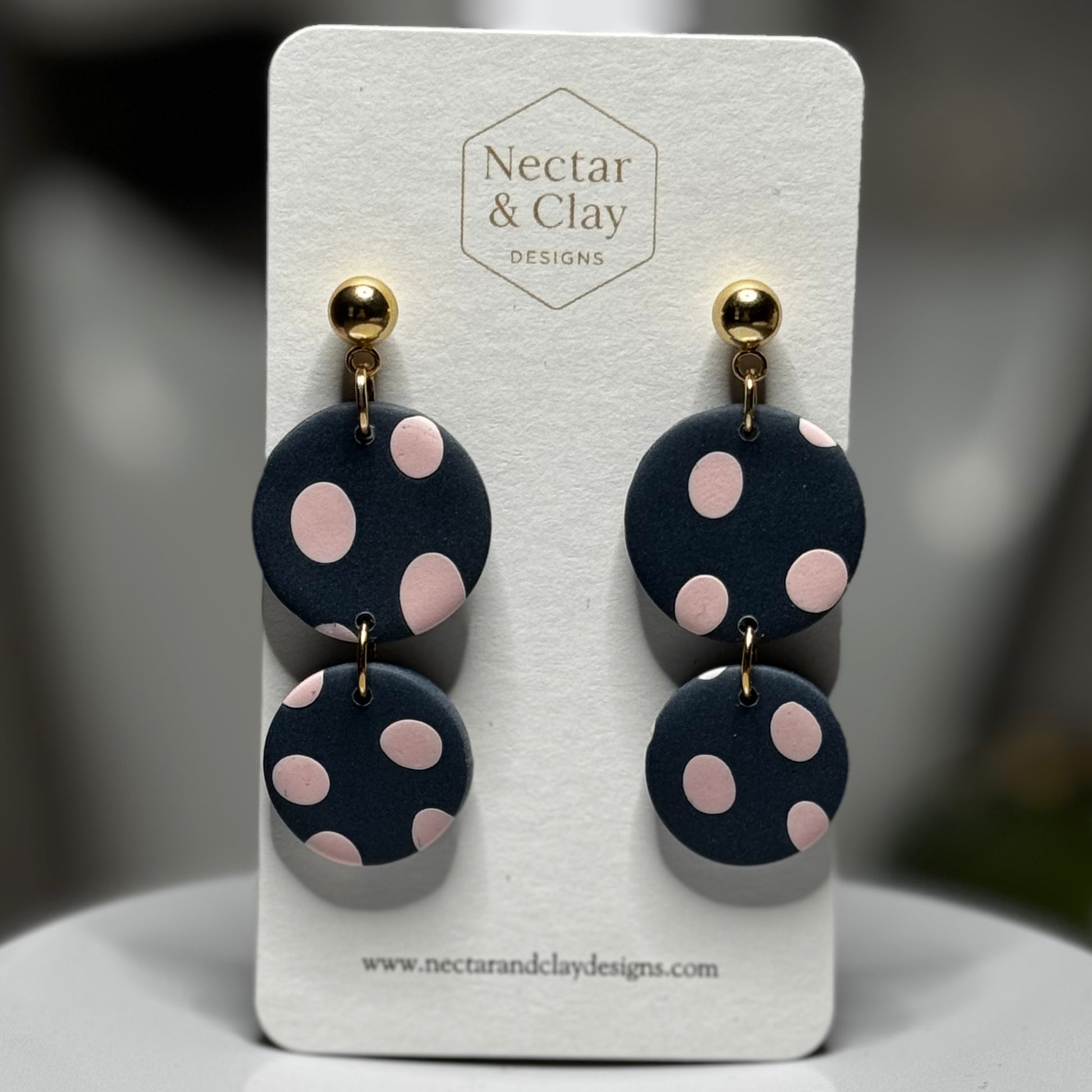 A timeless contrast of deep navy and delicate blush dots, Midnight Blush brings playful charm with an elevated edge. The soft pink polka dots add a romantic touch, while the rich navy base keeps the look refined and versatile. Finished with polished gold accents (nickel-free), these earrings are perfect for effortless day-to-evening styling.