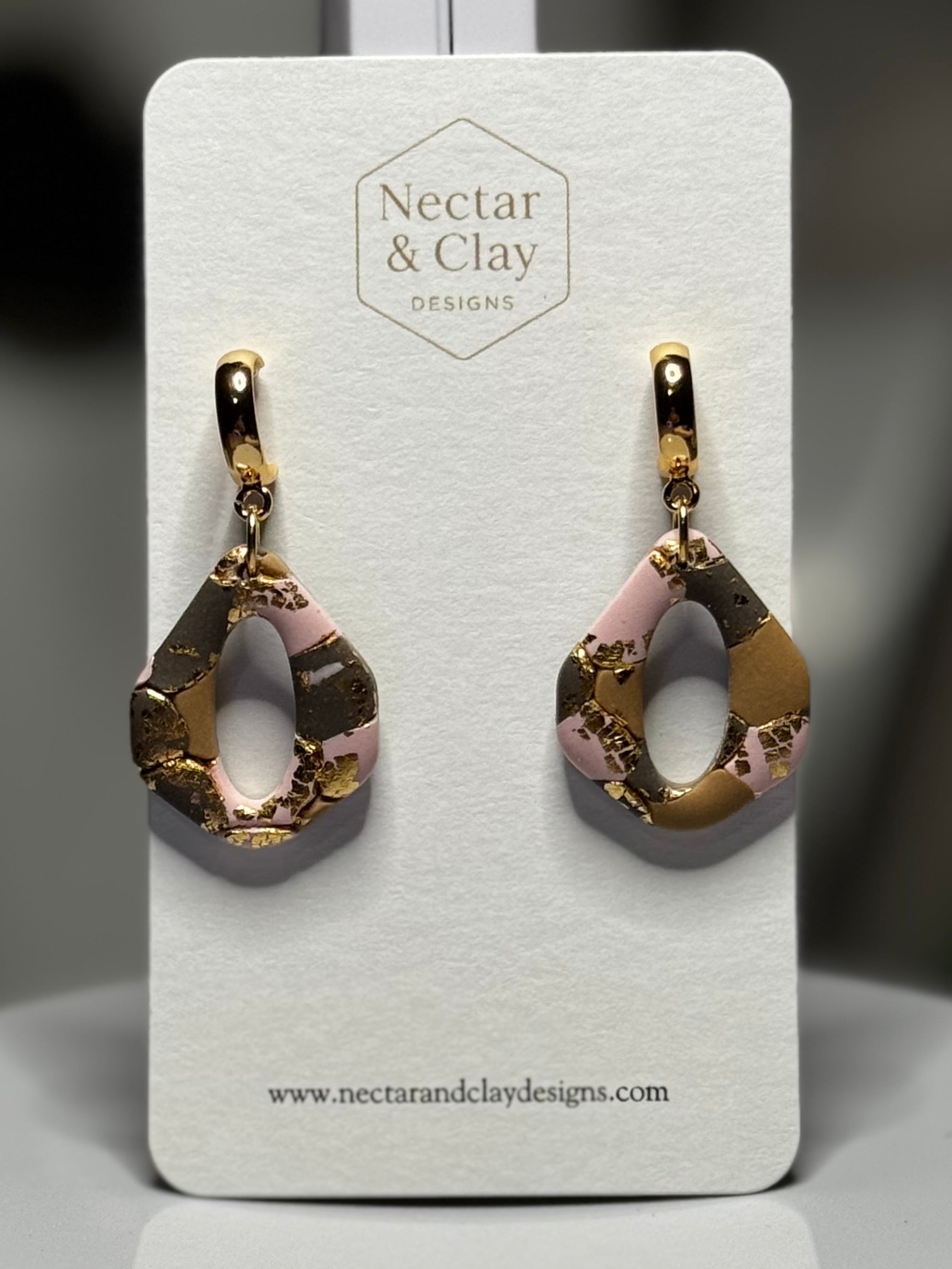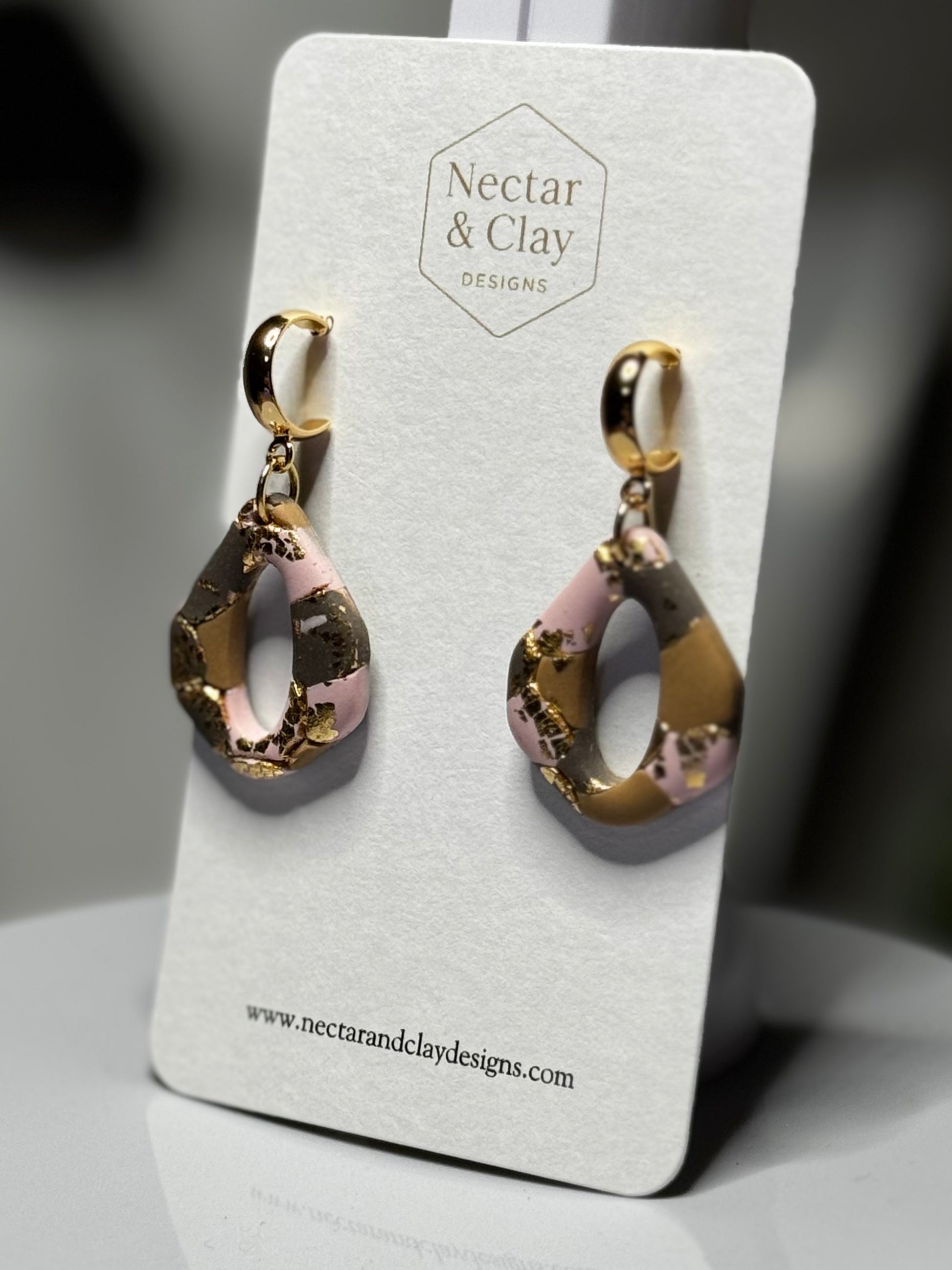 The Mosaic Rose hoops blend soft blush, warm taupe, and champagne tones with delicate flecks of gold leaf for an artful, elevated finish. Framed by polished gold (nickel free) huggie hoops, each pair feels modern yet timeless. Lightweight and handcrafted, these earrings are designed to add subtle luxury and effortless sophistication to everyday looks or dressed-up moments. Measuring 1.5" in length.