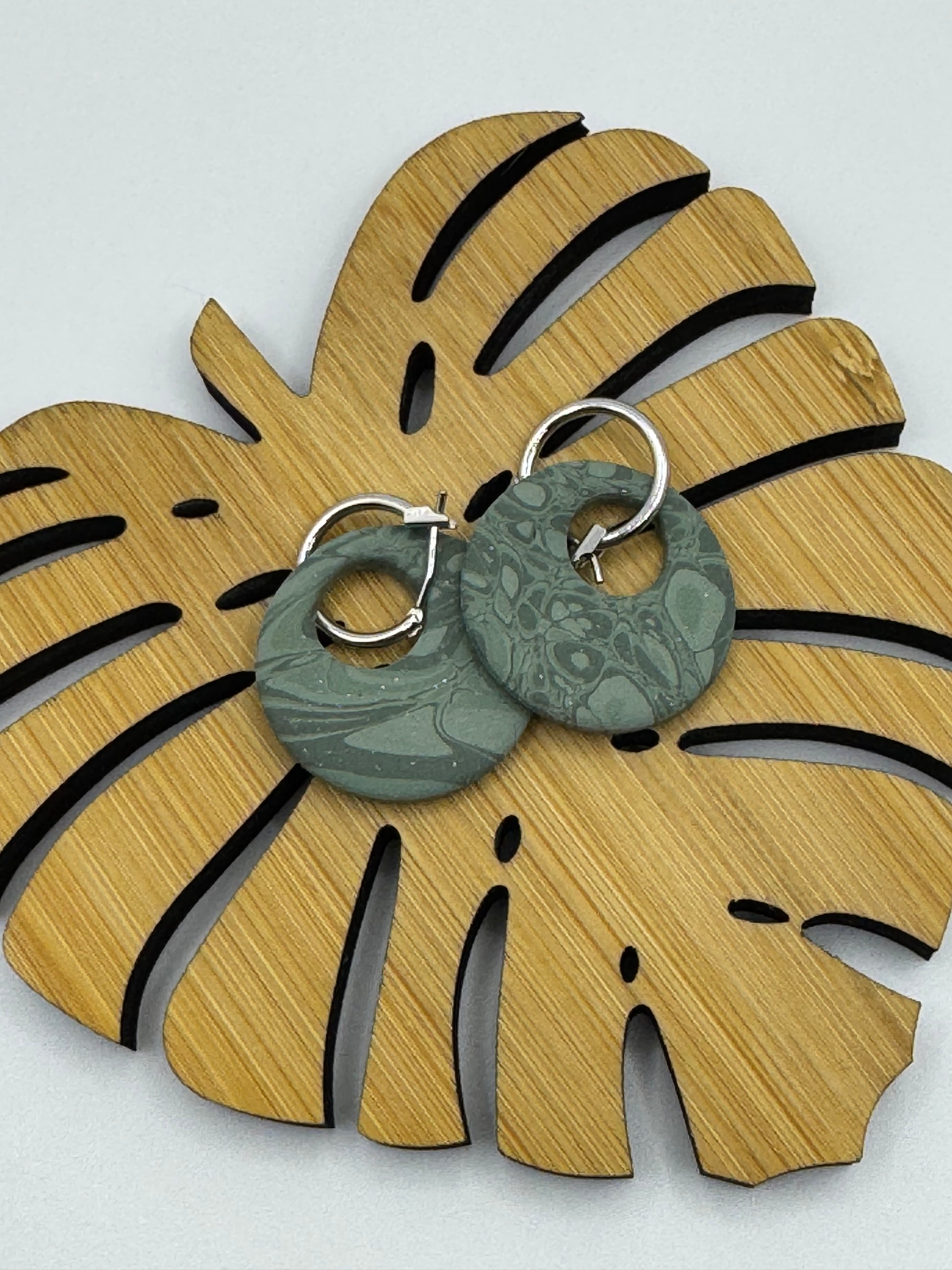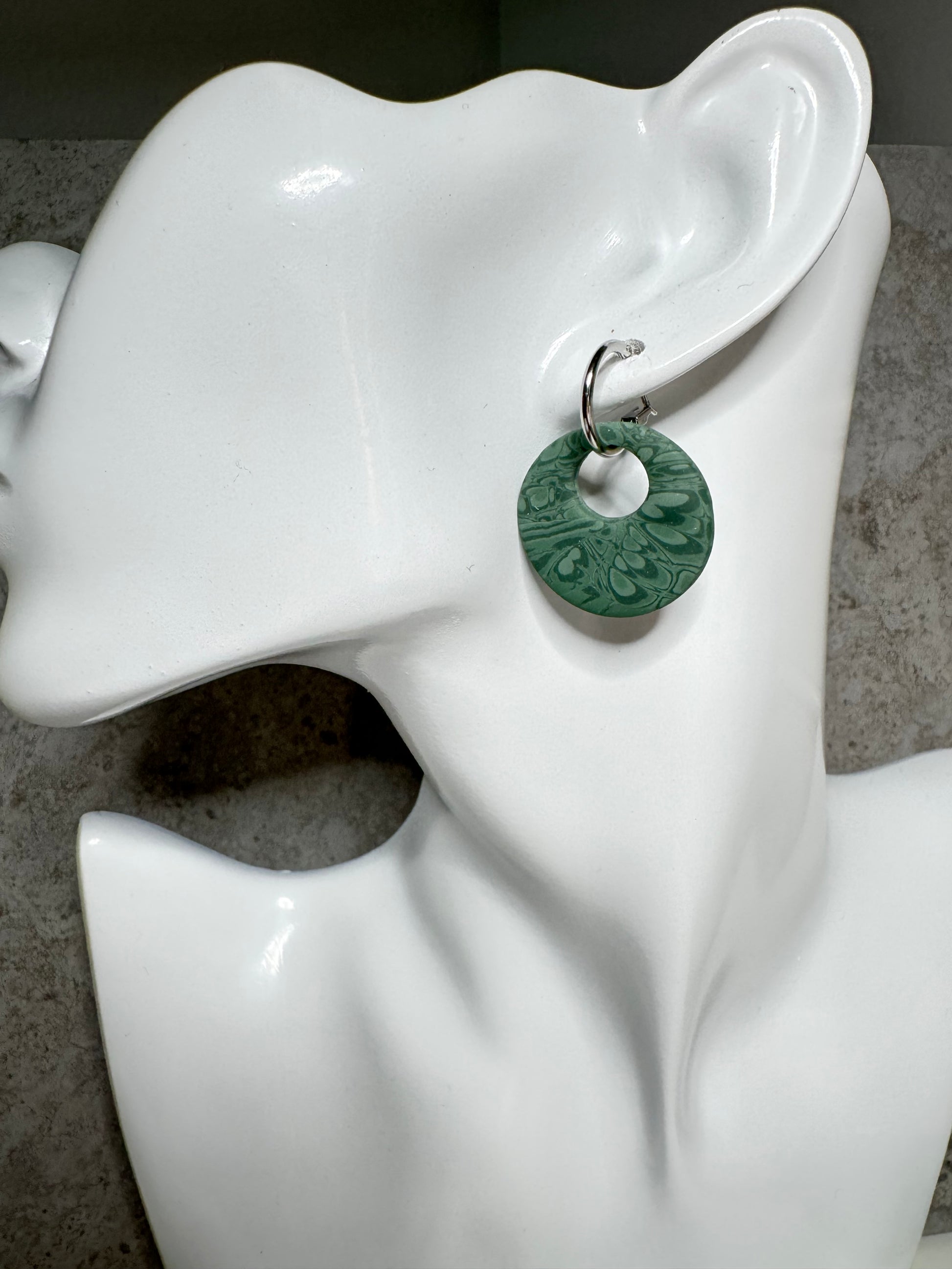 Subtle. Sophisticated. Effortlessly natural. These lightweight polymer clay hoops feature a swirling marbled green design that mirrors the depth and calm of moss-covered stone. Finished with sleek stainless steel hoops, Moss Mirage brings an organic elegance to any look - perfect for both everyday wear and statement simplicity.