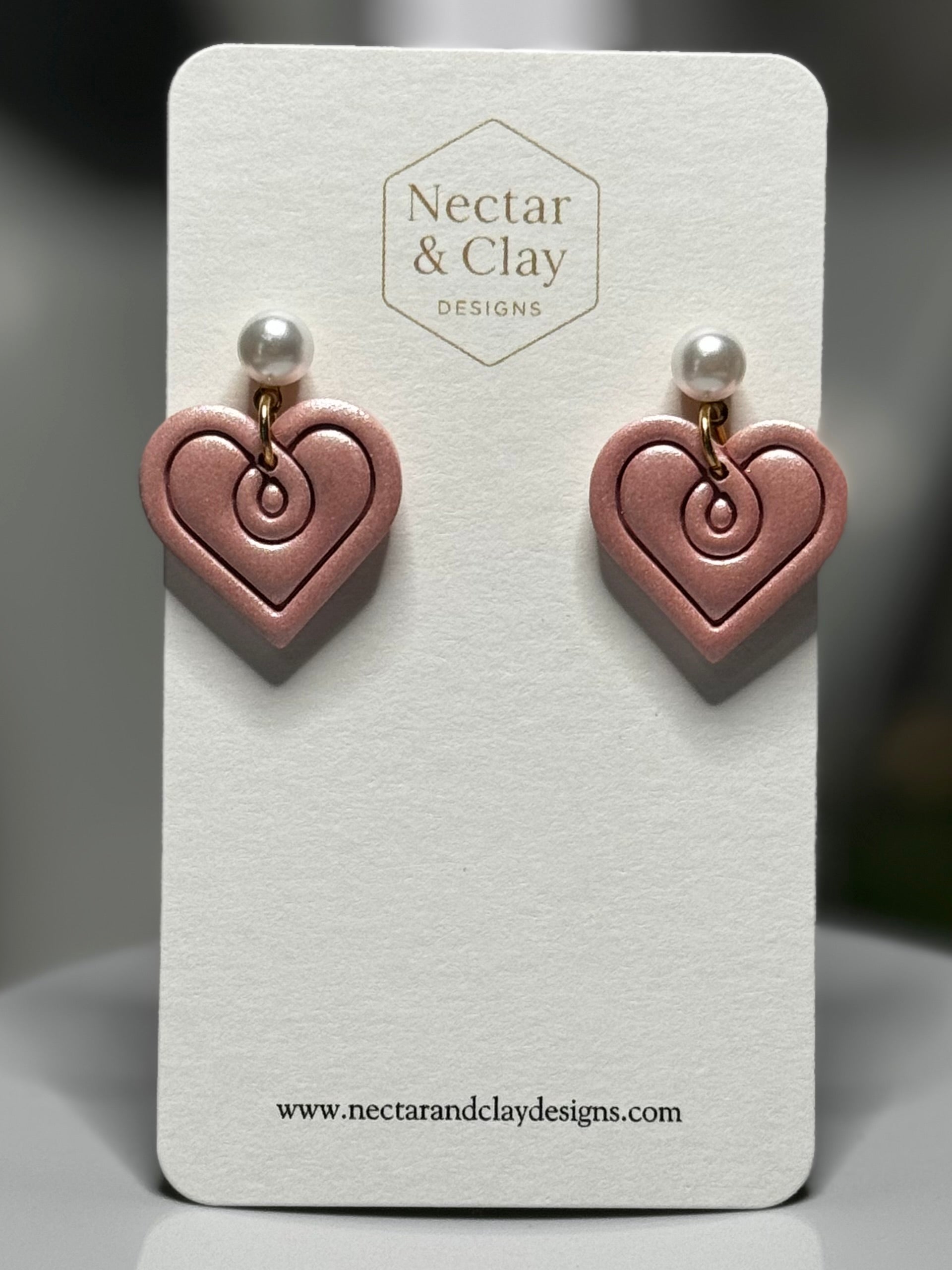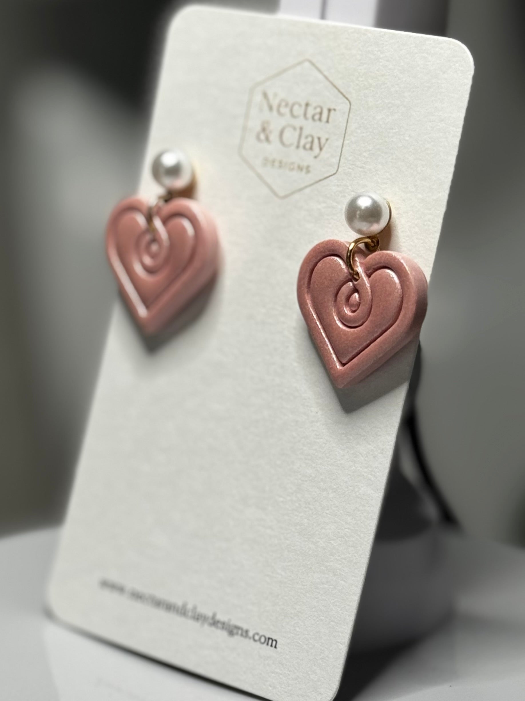 Pearl Rose Amour earrings feature delicately sculpted heart drops in a soft rose clay, finished with timeless pearl studs for an elegant contrast. Subtle etched detailing adds texture and depth, while the lightweight design ensures effortless wear. Handcrafted with care, these earrings bring a refined touch to both everyday looks and special occasions.