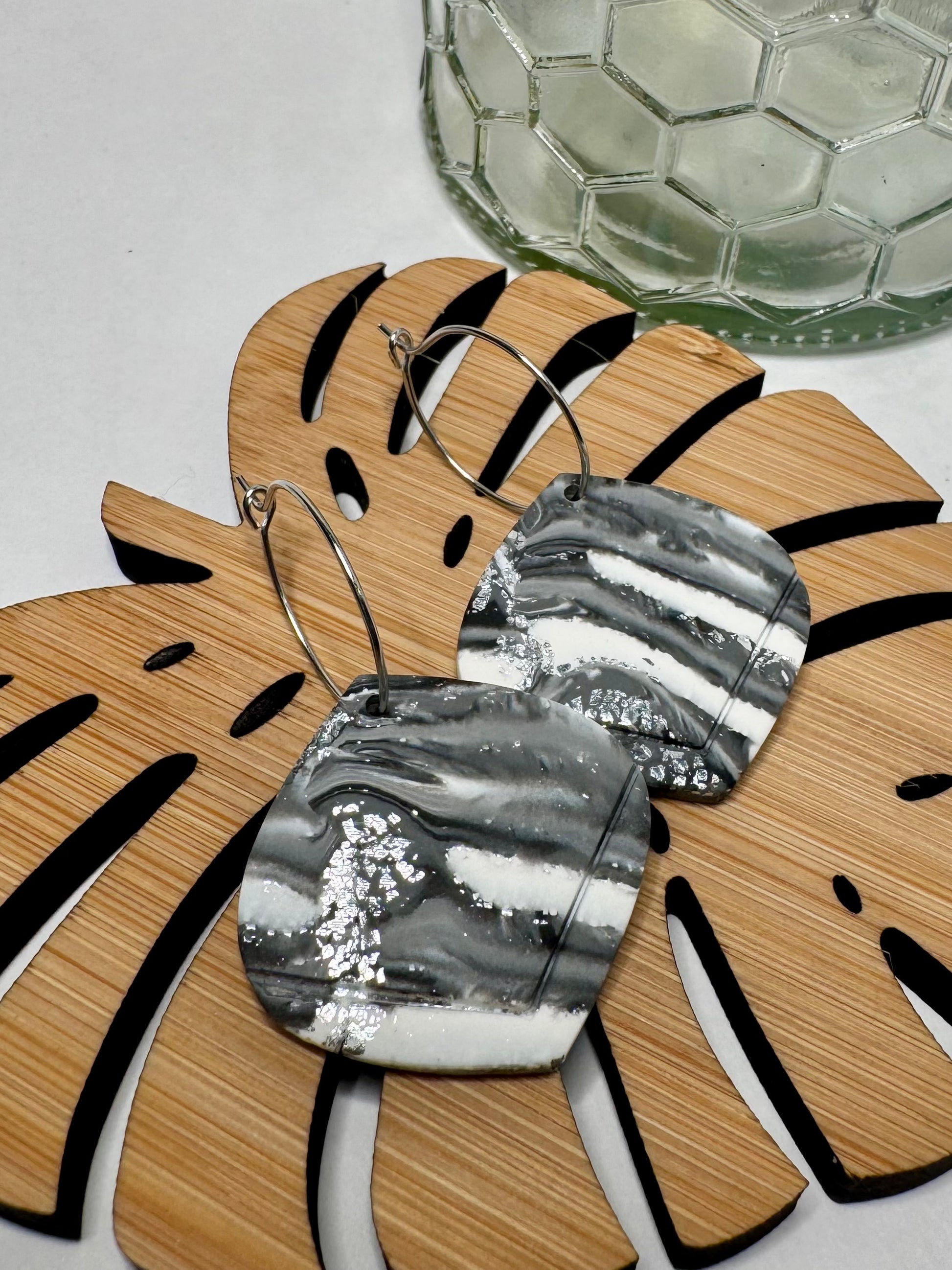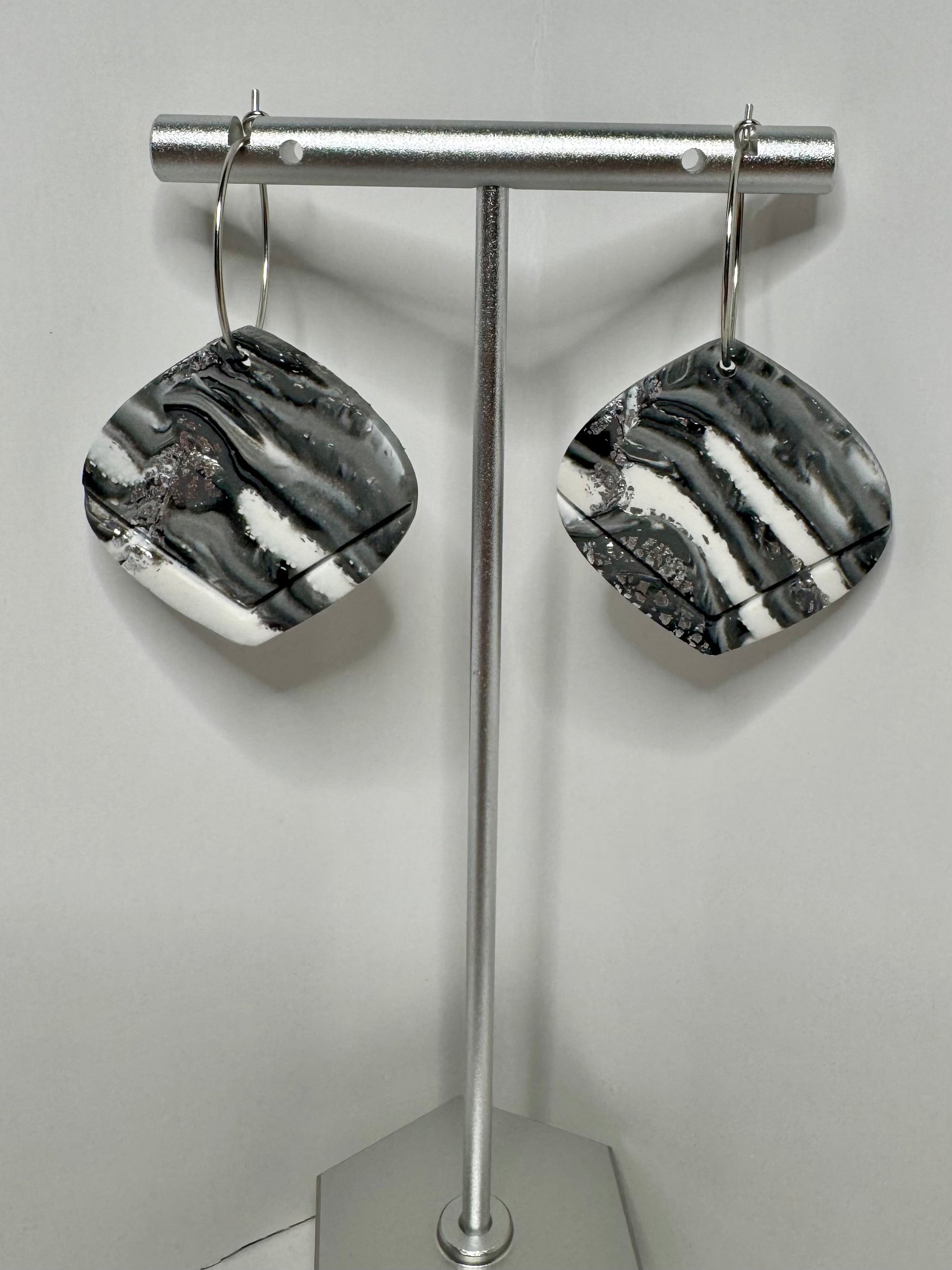 Stunning handmade polymer clay earrings featuring a sophisticated black, white, and gray marble swirl design with delicate silver glitter accents inspired by the Stormy Sky and bursts of lightning. These unique, lightweight earrings are suspended from elegant silver-tone hoops, perfect for adding a touch of modern artistry to any outfit.