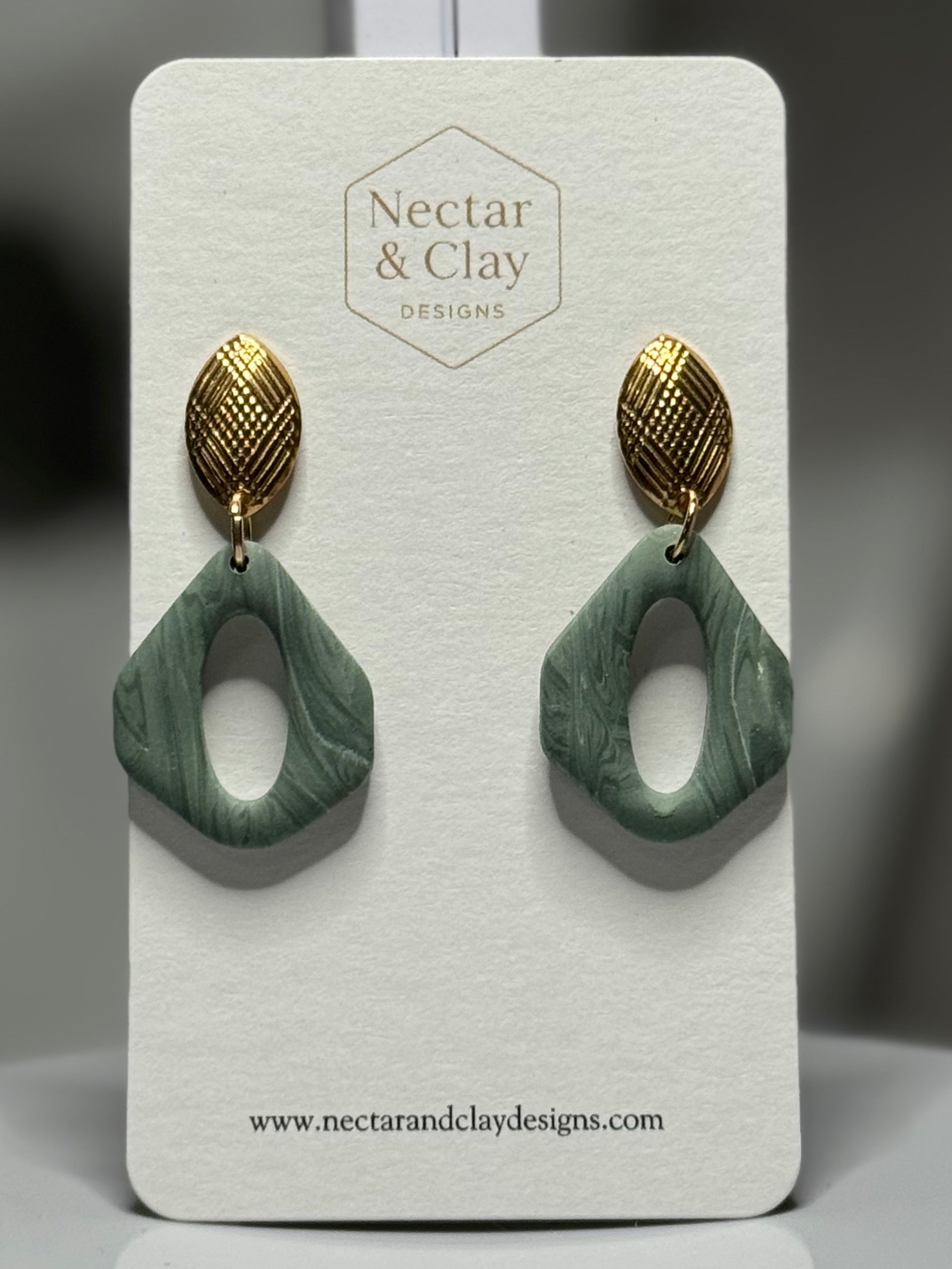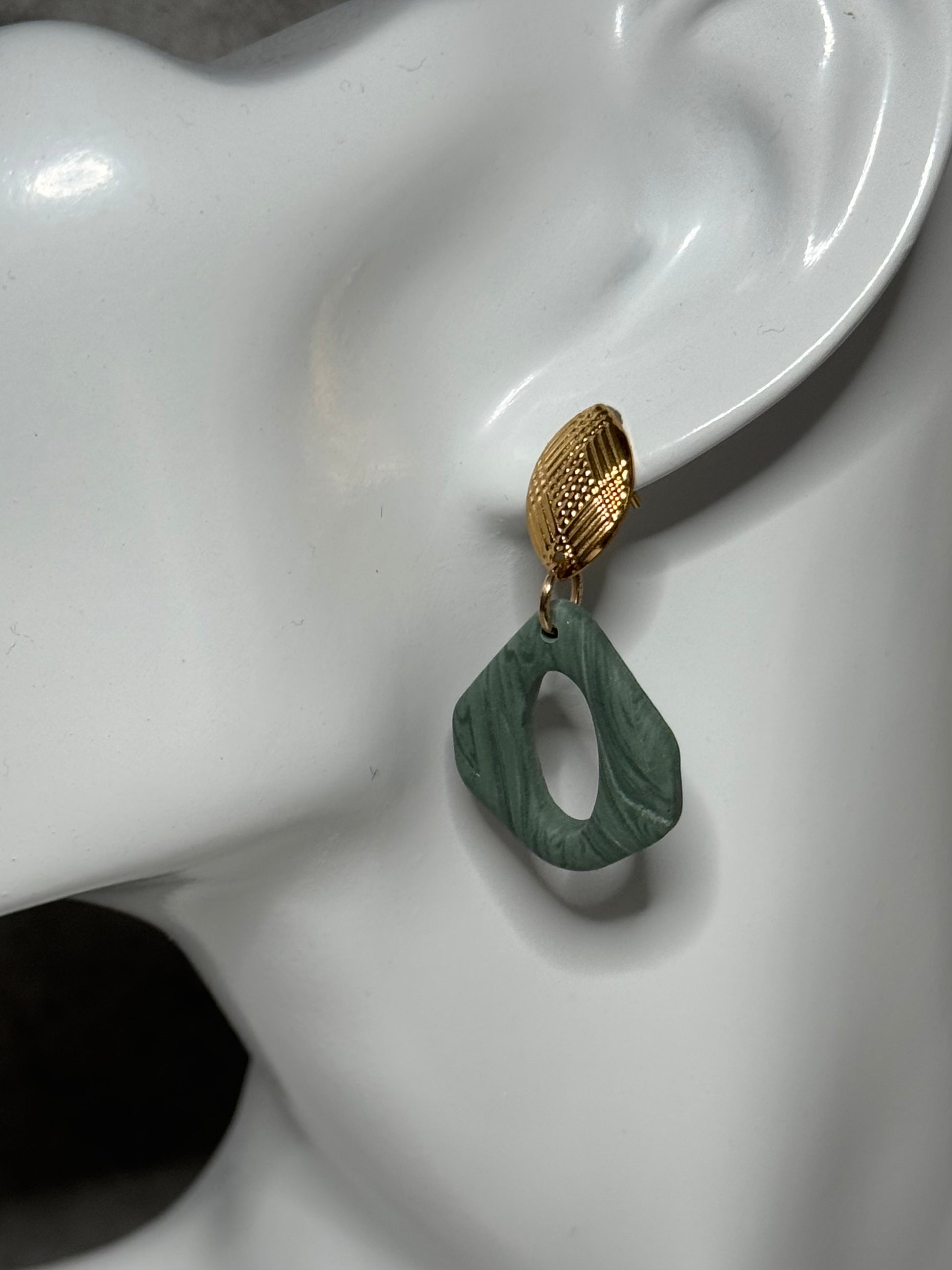 Verdant Glow earrings combine earthy calm with golden elegance. Featuring a marbled sage-green clay in a bold geometric cut, paired with textured gold studs, these earrings bring balance between nature - inspired beauty and modern design. Lightweight and versatile, measuring approximately 1.5" in length, they're the perfect statement piece for both everyday wear and elevated occasions. Made with 14K gold plated studs.