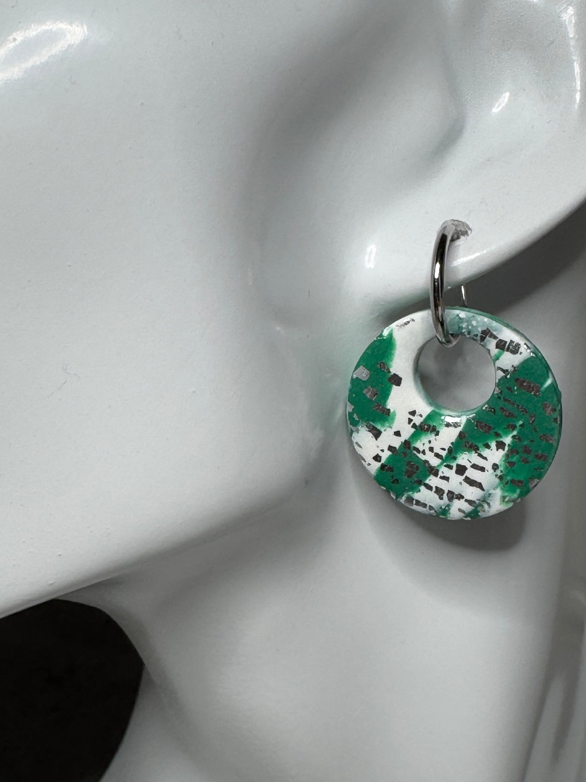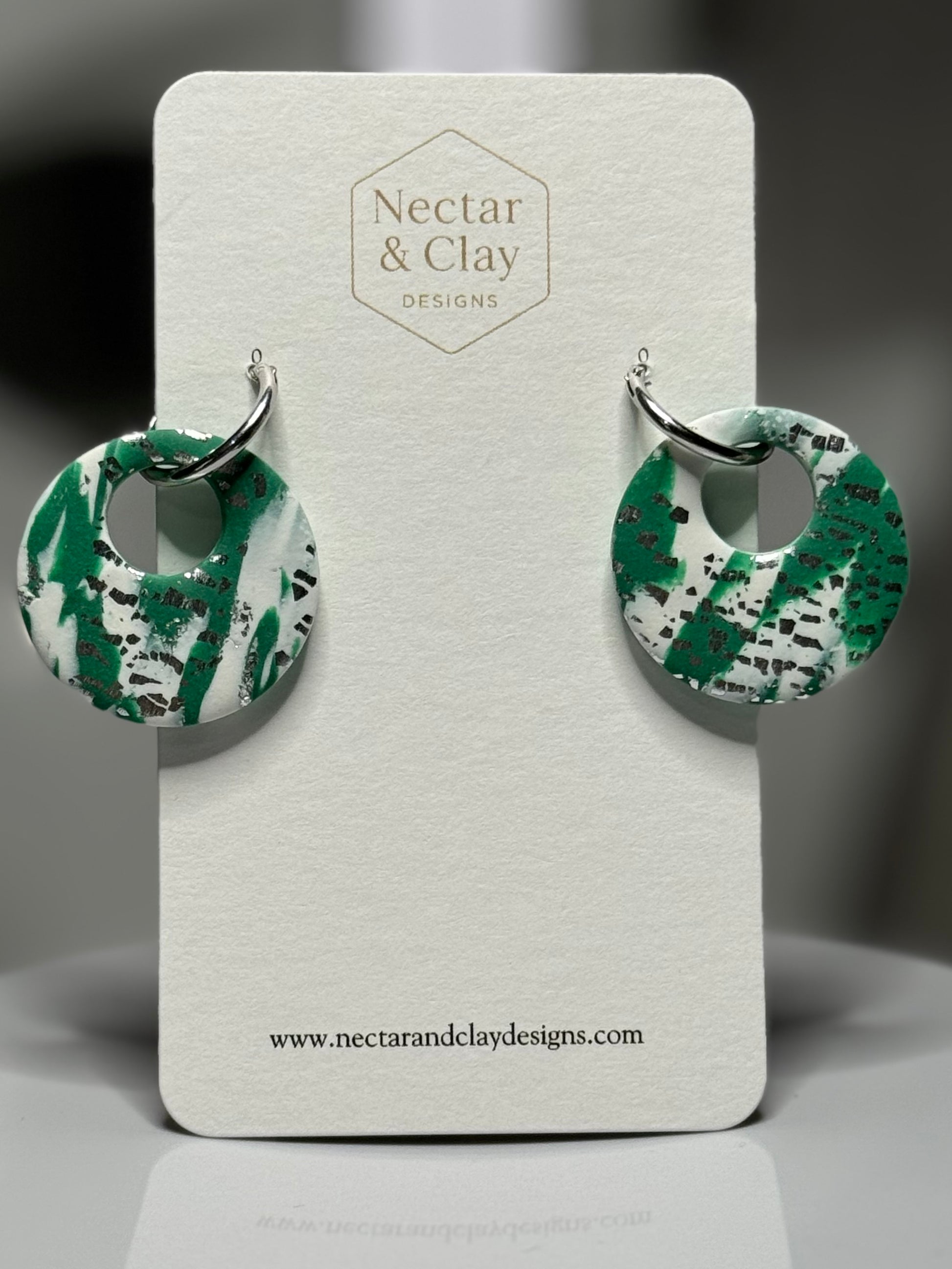Bring a touch of winter magic to your holiday style with the Winter Pine Swirl earrings. Handcrafted from polymer clay, each pair showcases a swirling mix of deep pine green and crisp winter white, accented with a hint of shimmer for a frosted finish. The open-hoop silhouette creates a modern, airy look while remaining incredibly lightweight and comfortable for all-day wear.