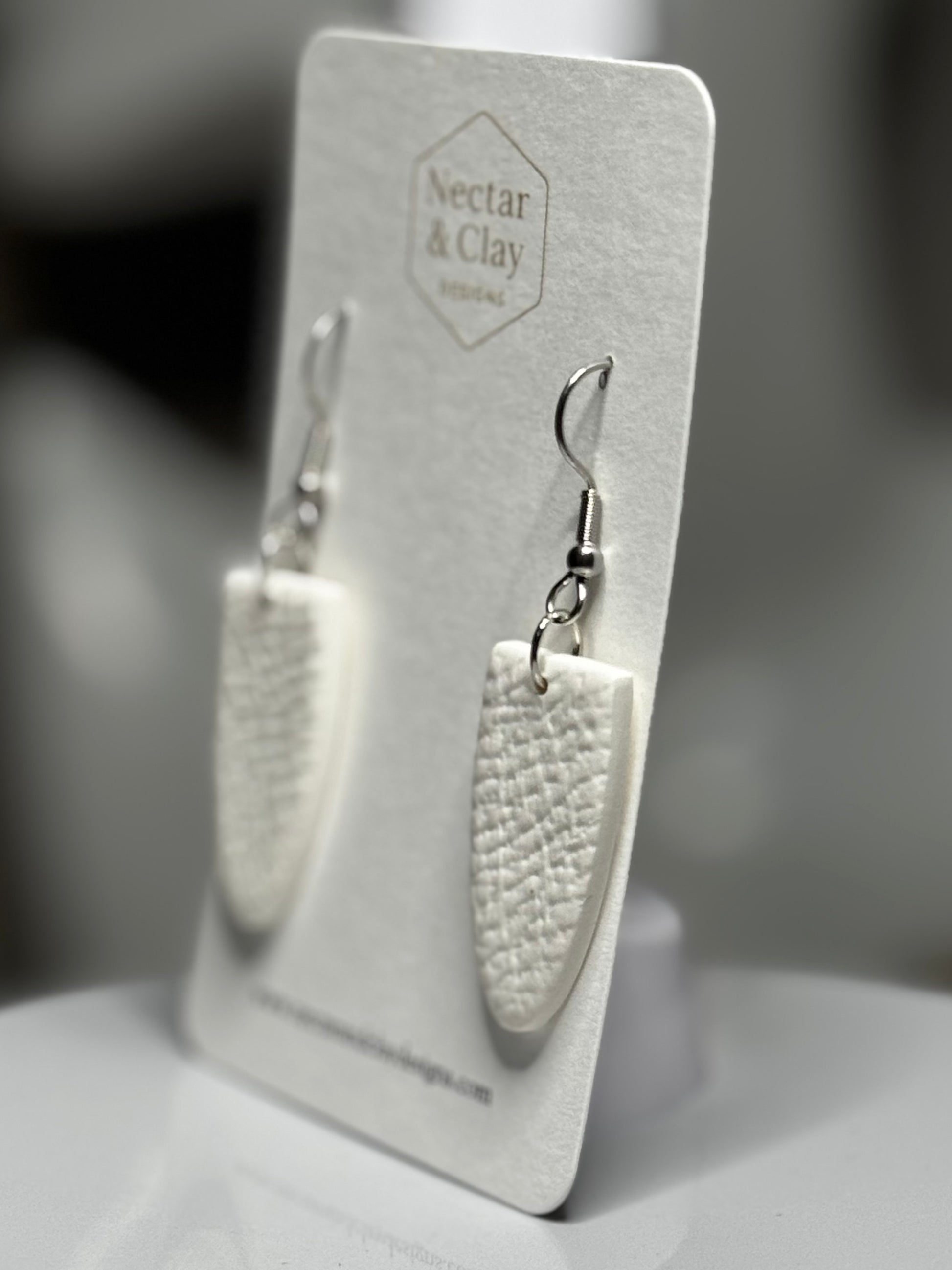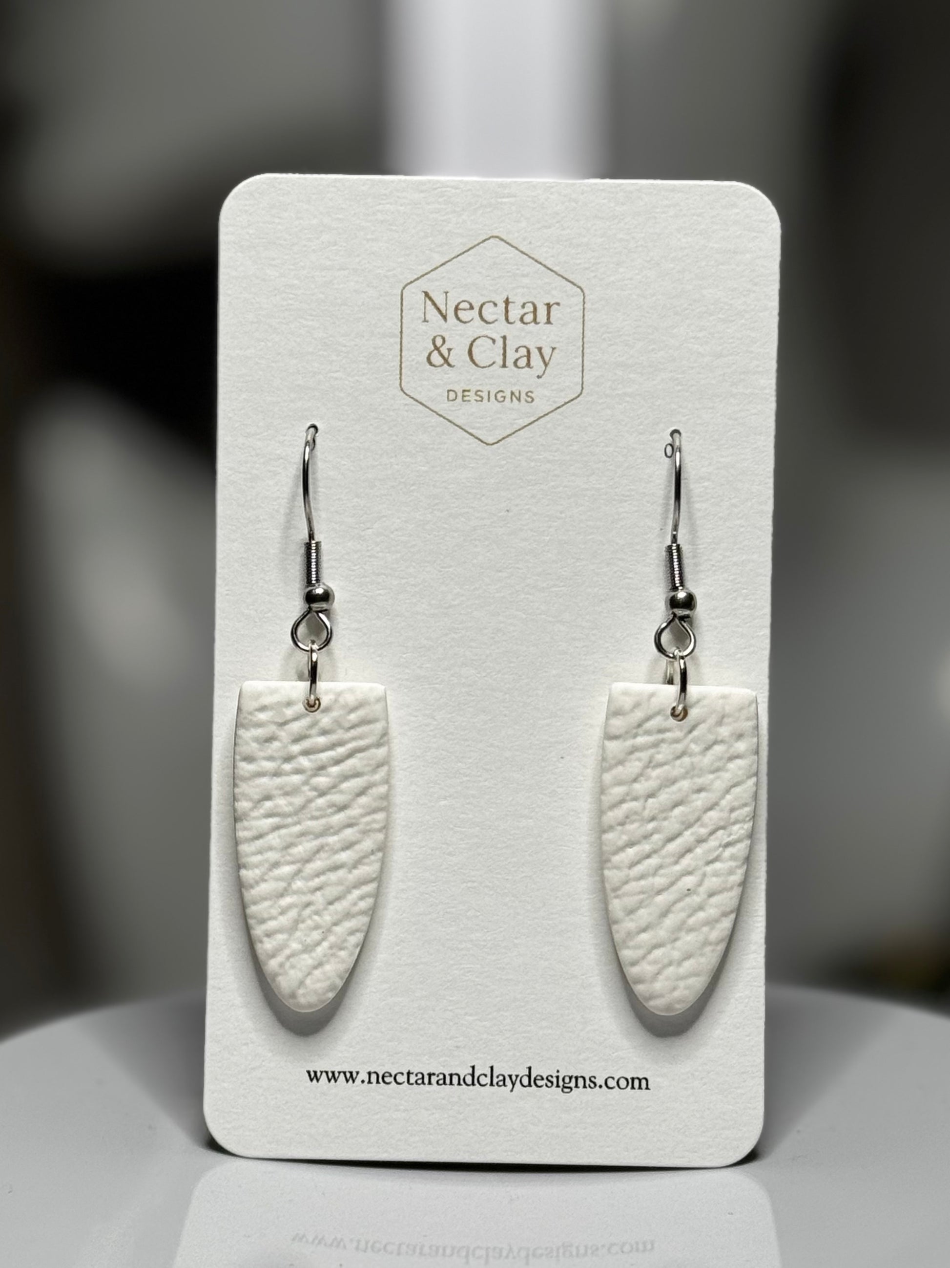 Crisp and understated, the Winter White Drop earrings feature a cool, igloo-white clay with soft leather texture and a sleek elongated shape. Lightweight and effortlessly modern, this pair brings a fresh, minimalist touch to everyday and seasonal styling.